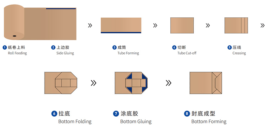 The machine is used to produce environmental protection paper bags, food paper bags, shopping paper bags and various kinds of portable paper bags with paper as raw materials. The machine completes the bag making of primary color paper or printed web paper at one time through the machine, and the paper is coated with edge glue, formed into a cylinder, cut off, indented, glued at the bottom, formed at the bottom of the bag and transported out of the bag. The whole process is completed simultaneously at one time. Truly fully automated production, can effectively save labor costs.