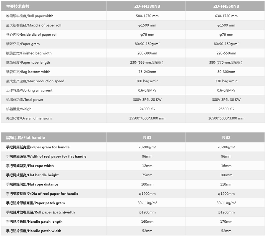 该设备用于生产带扁绳手挽(可内折&外翻两用)的手提纸袋,由手挽工位将卷筒原纸制作成扁绳和卷筒纸片裁切并粘合成手挽,通过输送系统将做好的手挽传送给袋口指定位置、再经传送压把的 工位送给纸袋成型机组,再由纸袋成型机组将贴有手挽的原料纸张进行涂边胶、成筒、切断、压痕、底部涂胶、袋底成形并输送出袋,整个过程一次性同步完成,真正实现了全自动化生产,能够有 效地节省人工成本。