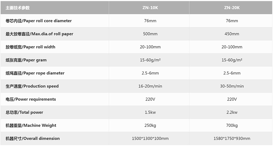 产品介绍 该设备主要用于高速制作圆型的纸绳,纸绳制作设备是手提纸袋机配套的辅助设备,设备的主要功能是根据需要将分切好的条状原纸进料旋绕后制成所需直径的圆型纸绳,同时可将制作好的圆型纸绳复收成整卷。 产品参数